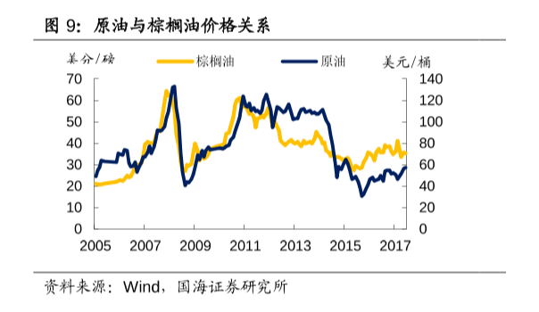 再从长周期来看,可以发现棕榈油与原油价格的规律走势确实是总体大致相似的。