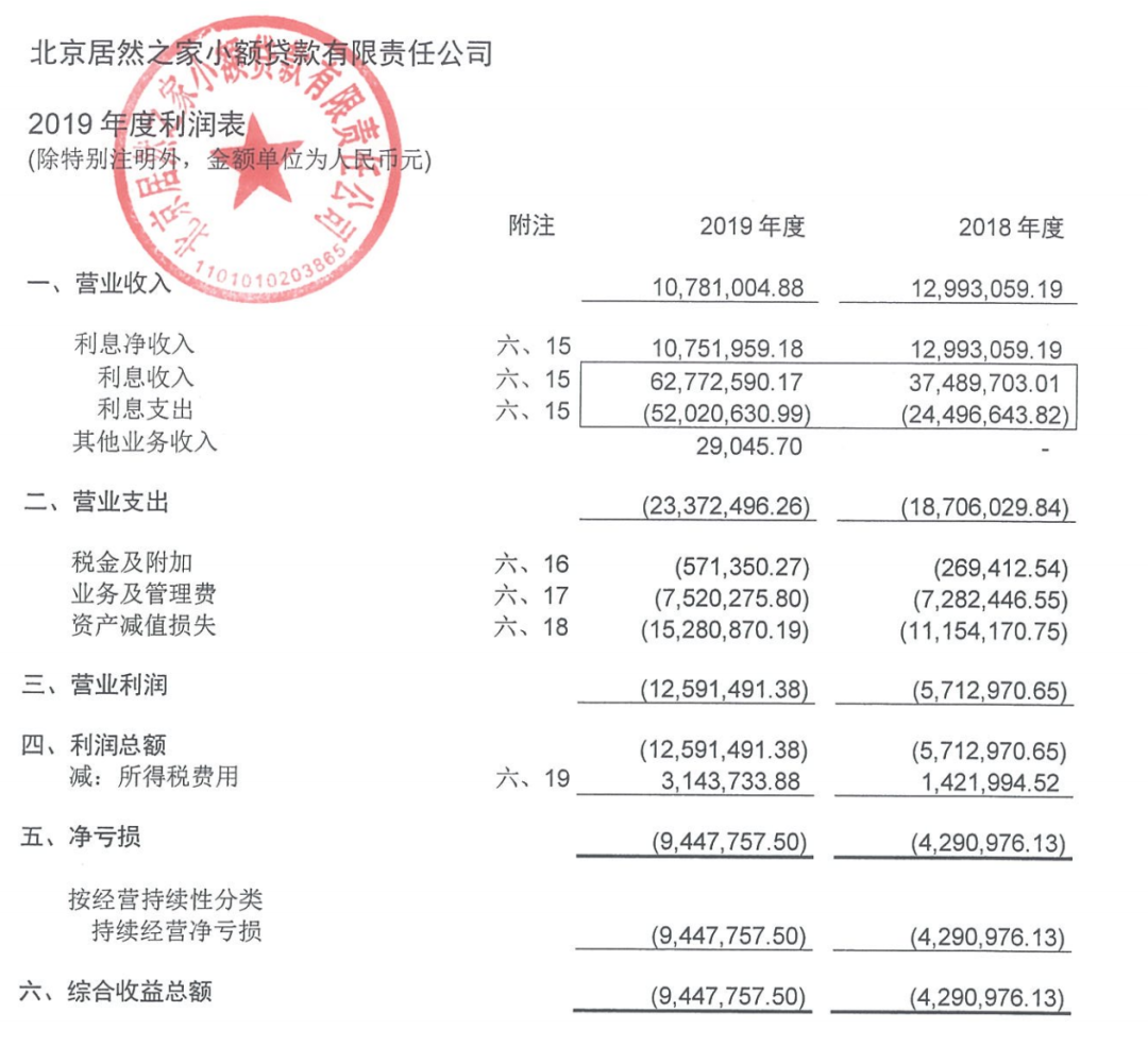 财报显示,截至2019年12月31日,居然小贷资产总额为5.09亿元,其中发放贷款及垫资为4.86亿元;全年营业收入为1078.10万元,净亏损944.78万元。