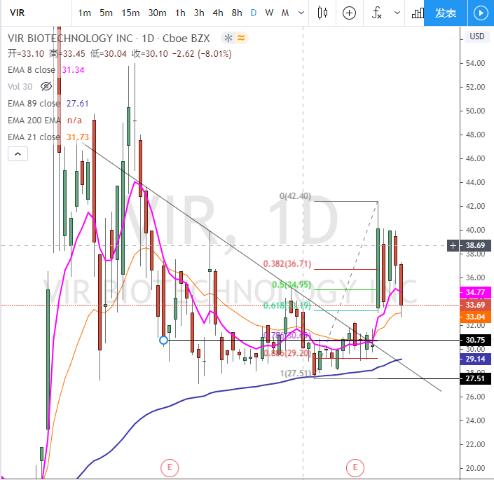 但其中一只VIR,我觉得列为我的关注股票。从技术面上VIR已经突破盘整,突破后回踩0.618的位置,但更好的位置30.75-27.5之间。只要到这个区间就可以考虑进场。$Vir Biotechnology, Inc.(VIR)$