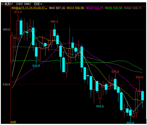 由于美国农业部发布的5月份供需报告利空以及美国小麦出口销售不振,且全球新型冠状病毒疫情蔓延,美国确诊病例已超过170万人,依然令人担忧经济发展,近期芝商所旗下CBOT软红冬小麦期货价格呈一路下跌趋势,截止5月22日收盘,主力7月合约收盘508.75美分/蒲式耳,较4月份高位557.50美分/蒲式耳跌48.75美分/蒲式耳。