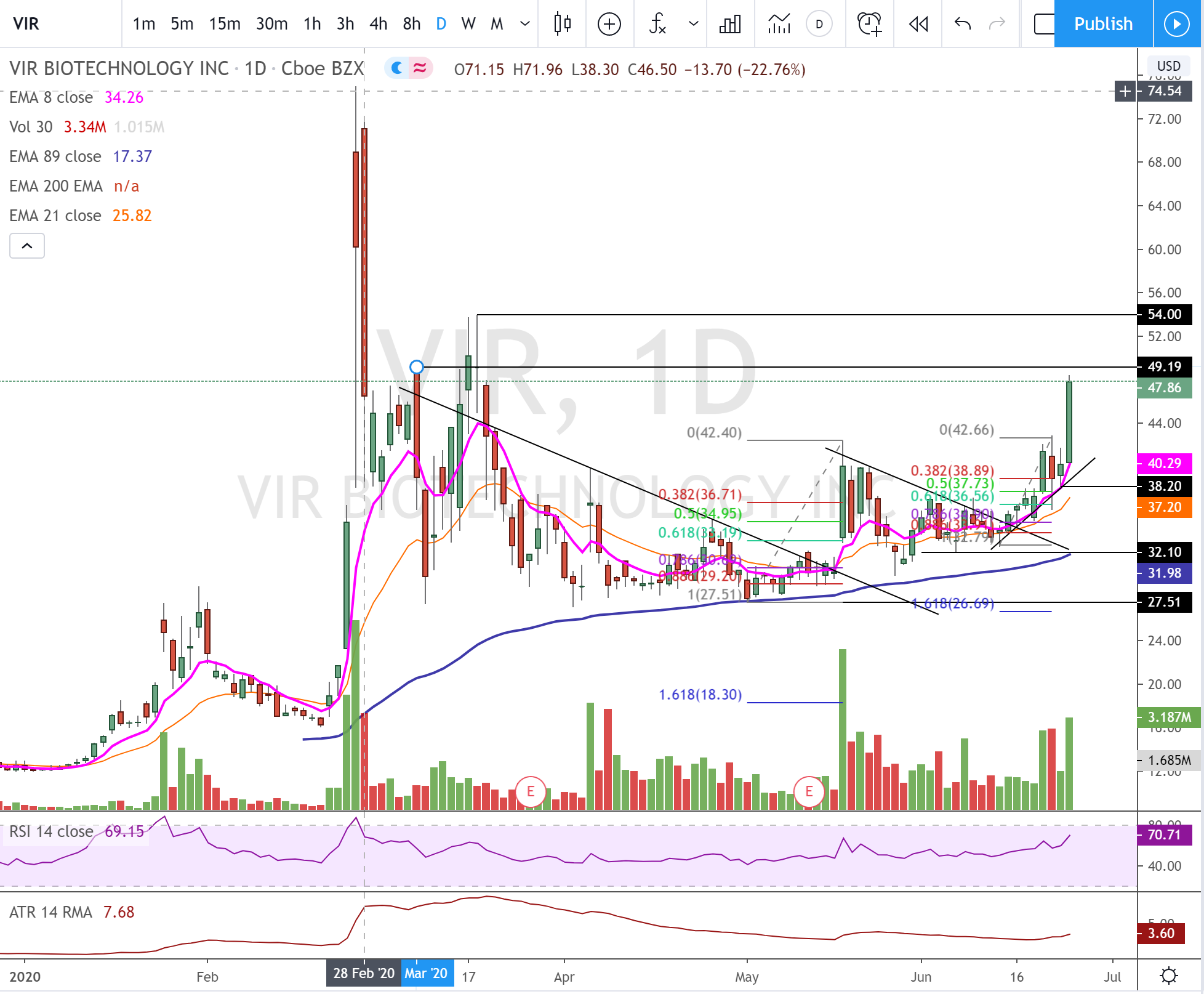 原来持仓两只股票,其中一个VIR今天涨了18.67%。今天我是慢慢减仓的策略做这只股票,虽然还差一点点到我的压力区间49.19-54 。但是总体来说涨的相当不错了。