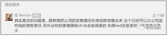 根据置顶留言,一位粉丝表示,“其实真正的问题是…静默期把公司的发售情况在微信群泄露出来,这个已经可以让公司追究他的泄密责任。另外这样的事情捅到sfc也会被调查的,如果md还是是持牌代表责任更大”据一位业内人士对新浪财经表示,“上市公司一般都有静默期,任何的业务数据都不能披露,即使面临香港证监会处罚一般也是董事代表或港证监持牌人士。”