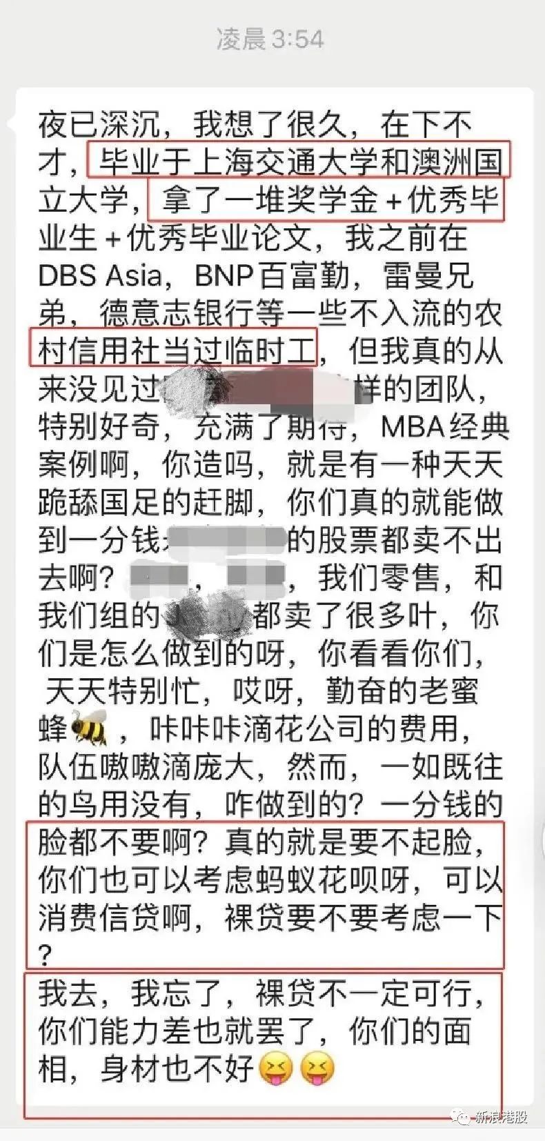 6月17日大约凌晨四点,自夸自己毕业上海交大,获了一堆奖,在雷曼兄弟、德意志等“农信社”当过临时工,“但自己从未见过像国信XX的团队,就像跪舔国足一样,你们一天天啥也卖不出去,我们组的零售都卖了很多耶。花钱不少,队伍不小,一如既往的鸟用没有,一分钱的脸都不要了?”