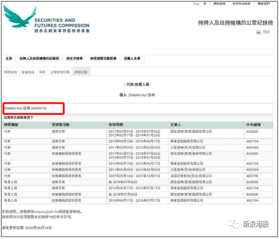 据爆料人对新浪财经表示,张辉为国信香港持牌人员。新浪财经查询发现,他在国信香港中央编号为AUX600香港证监会(SFC)规定所有持有证券交易牌照公司,最少聘请两名RO,申请时需在过往6年内具备3年行内经验,并要求起码2年管理经验