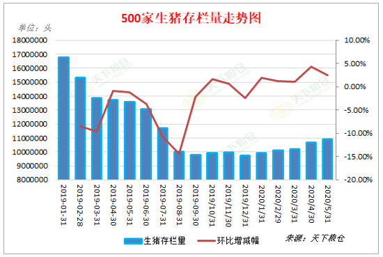 国内供应面:随着政策利好不断,生猪养殖利润又异常丰厚,Cofeed调查数据显示:截止2020年6月16日生猪养殖头均利润为1349.36元/头,较去年同期193.65元/头的盈利水平增加1155.71元/头,增幅为596.80%,养殖户补栏积极性高涨,国内生猪产能不断恢复,Cofeed调查数据显示:截止5月末,500家养殖企业生猪存栏为10905623头,较4月末的10646343头增加了259280头,增幅为2.44%,同比减少19.65%,但猪肉供应偏紧的格局还没有根本改变。