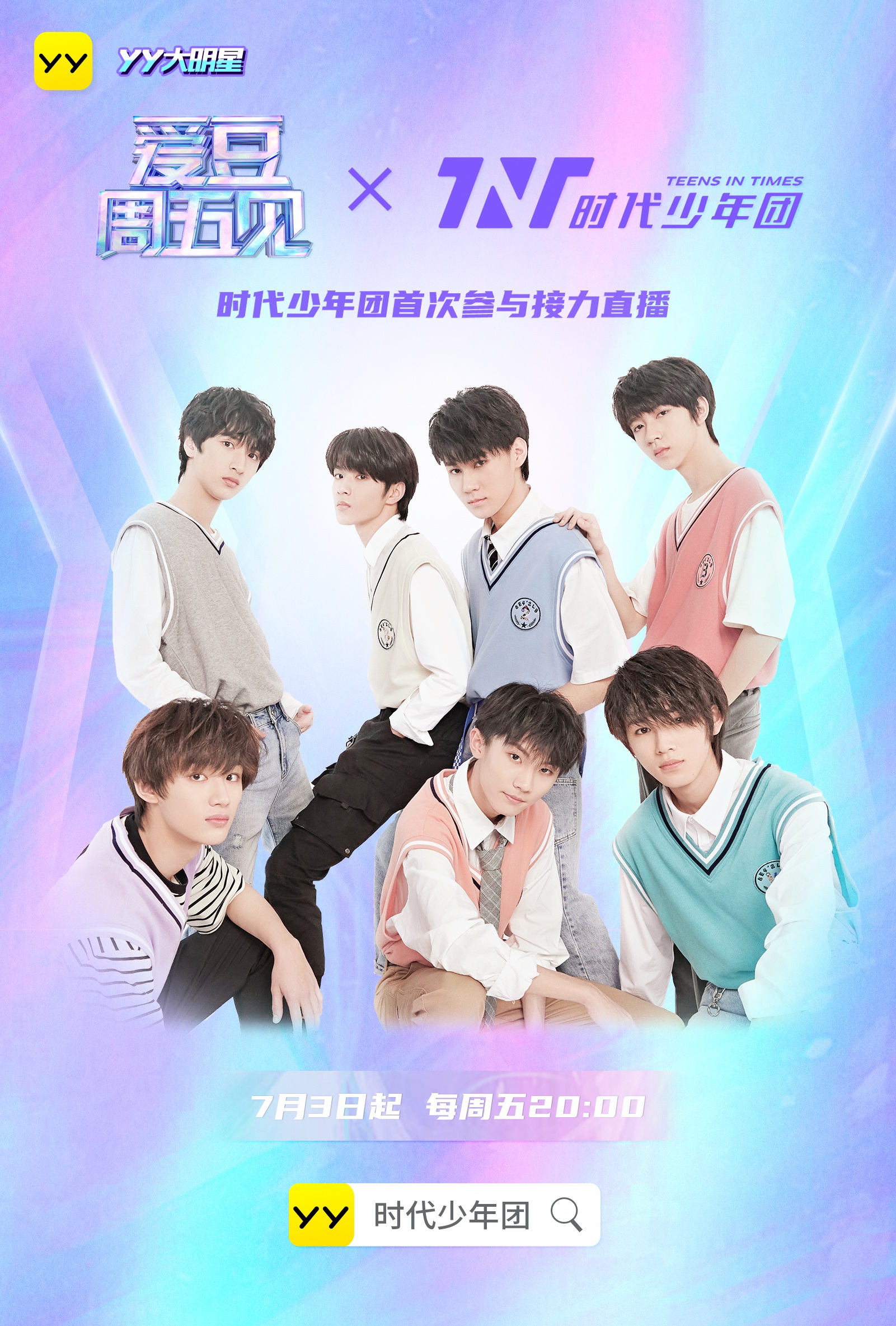 6月28日,YY直播宣布时代少年团全团入驻明星接力直播IP《爱豆周五见》,接档R1SE、UNINE、X玖少年团成为新的直播嘉宾,7位团员将在未来两个月的每周五晚8点在YY直播开启接力“宠粉”直播,在直播间进行才艺展示、粉丝互动、直播访谈等定制化直播内容。7月3日,“C位”马嘉祺将第一个亮相《爱豆周五见》进行直播。