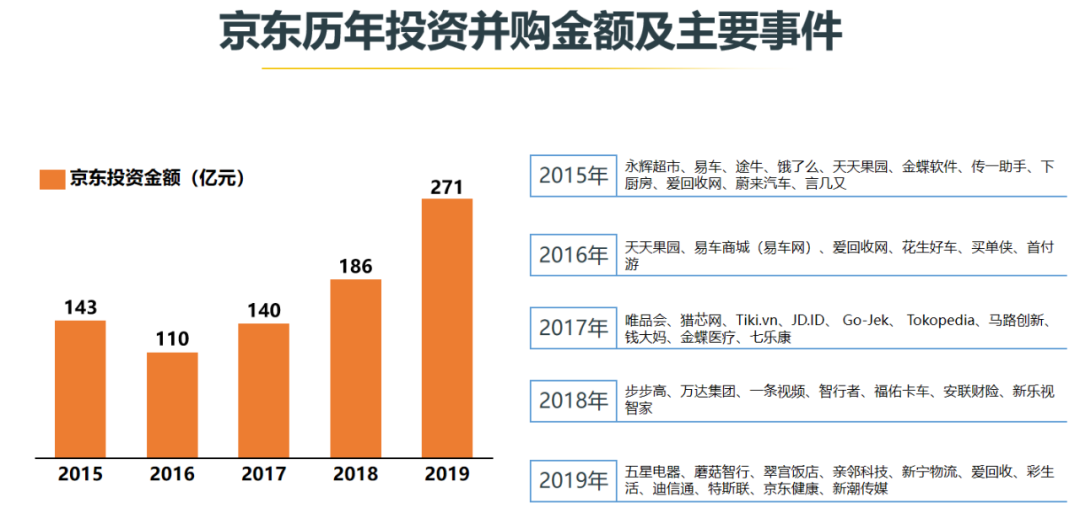回顾过去五年,京东对外投资并购金额稳步提升,2019年总金额达到271亿元,约是京东该年度122亿净利润的两倍。回港上市吸纳资金扩张商业版图,亦可以减少单一市场融资的风险。