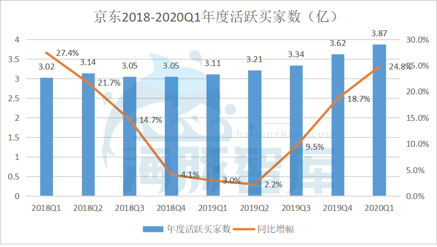 除此之外,另一个指标也很重要——年度活跃用户数。在人均消费金额稳定的前提下,GMV将随着用户数量而增长。从数据来看,京东2018年用户增长进入了瓶颈期,而2019年开始走出低谷,数据逐渐修复,今年一季度用户增量重回快车道。从用户规模来看,截至今年第一季度,京东年度活跃用户数有3.87亿,以阿里的7.26亿为标准至少还有一倍的发展空间。