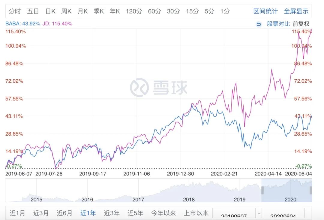 只是对比过去一年股价表现,阿里巴巴涨幅43.92%,而京东股价涨幅115.4%。京东已经彻底的走出阴影,从资本市场角度来看,京东显然被低估了。而股价反弹背后,则是业务的持续向好发展。