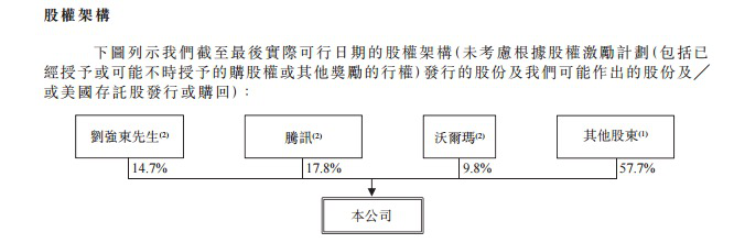 截至最后实际可行日期,刘强东持4.485亿股普通股,占股15.1%,拥有78.4%的表决权;腾讯全资子公司黄河投资有限公司持有5.272亿股普通股,占股17.8%,是最大股东,拥有4.6%的表决权;沃尔玛持2.89亿股普通股,占股9.8%,拥有2.5%的表决权。