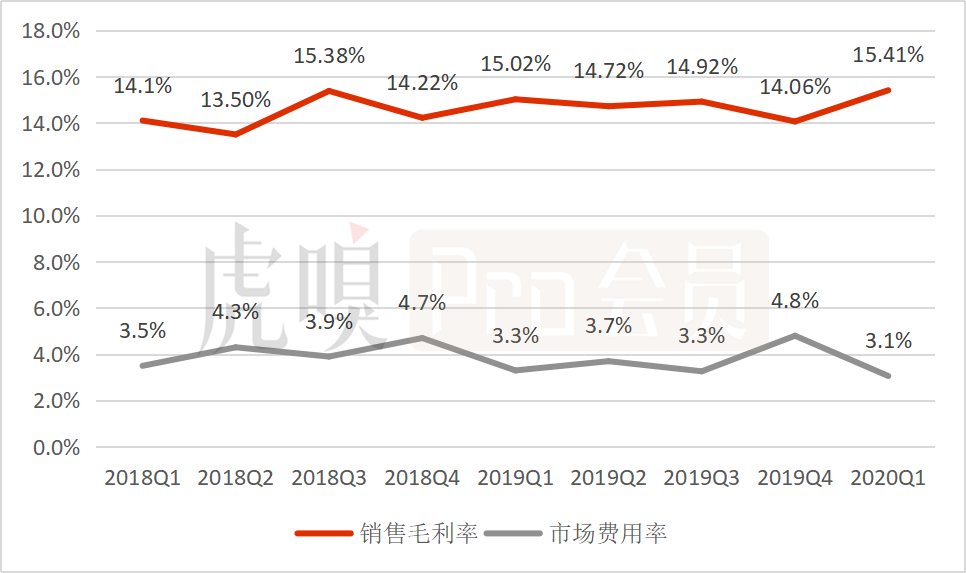 而且由于在疫情期间,京东高毛利率的日用百货类商品增长强劲,在一季度实现524.6亿元,同比增长38.2%;而低毛利率的3C&家电业务出现萎缩,高毛利业务占比提升致使京东2020Q1的销售毛利率同比提升0.39个百分点。以及京东减少了大量的优惠补贴,优化了市场费用,导致当期市场费用率同比下滑0.2个百分点至3.1%,有助于京东释放出更大的利润空间。
