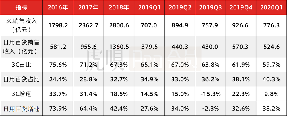 对于电商平台而言,用户是营收增长的主要驱动力。京东2020Q1的用户增长亮眼,但受疫情影响,占比较大的3C&家电销售下滑较为严重,在2020Q1仅同比增长9.8%,拖累了京东整体业绩。因此,用户基数的进一步扩充,并没有带来营收的大幅增长。