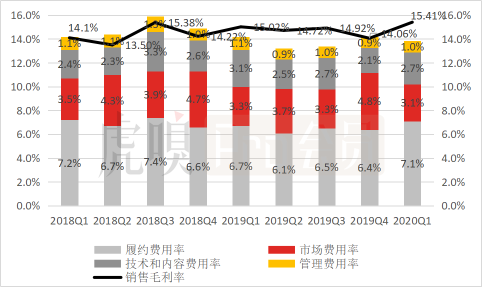 但京东归母净利润同比降低85.34%,主要是2019年同期的投资收益为68.86亿元,若剔除此部分影响,京东2020Q1的扣非净利润为12.056亿元,同比增长178.42%,这主要得益于京东毛利率和费用管控能力的双重提升,报告期内京东的综合费用率为13.9%,同比降低0.3个百分点。