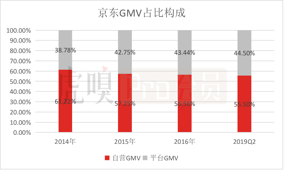 但是从通常情况看,京东平台业务的扩张依然比较缓慢。从GMV占比来看,京东平台GMV占比从2014年的38.78%提升至2019Q2的44.5%,4年半的时间仅提升5.72个百分点。所以,京东要想释放更大的盈利空间,需要进一步加快平台化的步伐。