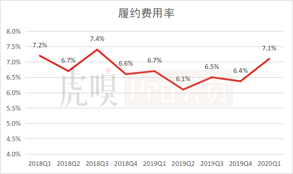 从费用端看,京东2020Q1的综合费用率达到13.9%,环比降低0.3个百分点,主要是市场费用率和研发费用率有所下降所致。但当期的履约费用率却同比提升0.4个百分点,主要是在疫情影响下,京东第三方物流服务规模萎缩以及在服务保障的前提下必然耗费更多履约成本。