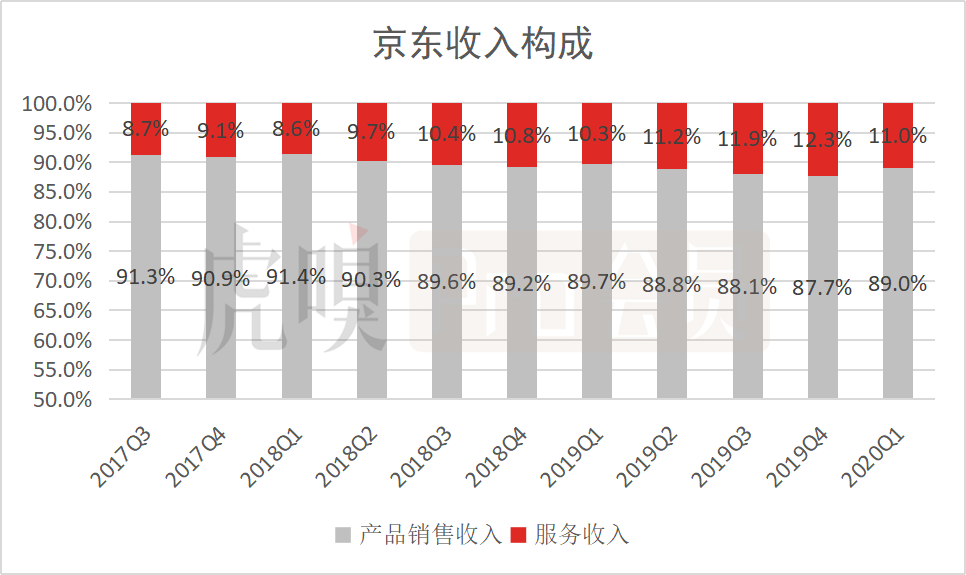 但京东的平台业务在疫情期间受供应链影响,增长受限,导致其服务收入占比降至11%。