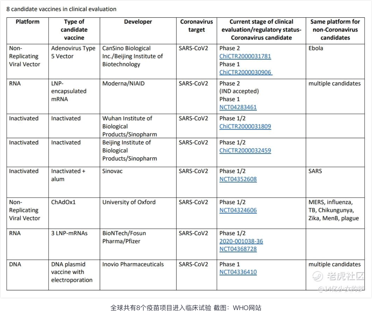 世界卫生组织(WHO)5月15日公布名单显示,全球目前共有118个研发中的新冠病毒疫苗项目,其中8种疫苗已进入临床试验阶段:中国机构占4个,美国2个,德美合作1个,英国1个。