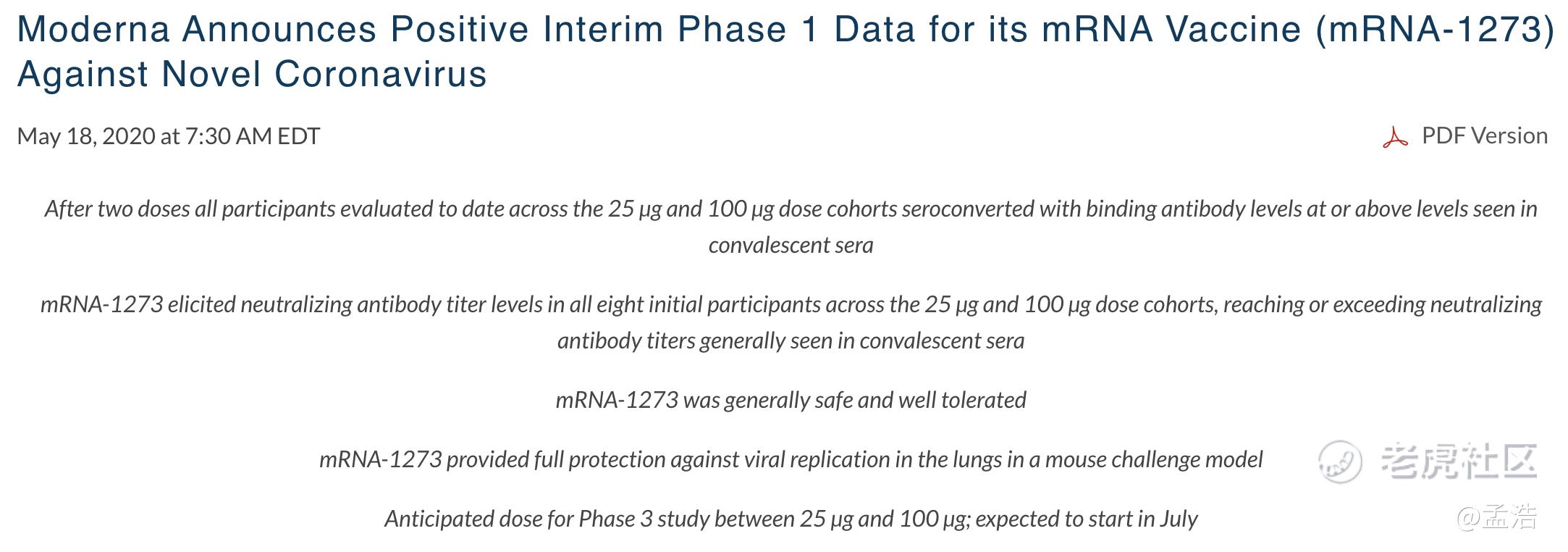 北京时间5月18日消息,美股疫苗概念股$Moderna, Inc.(MRNA)$ 表示用于新冠肺炎的疫苗MRNA-1273是安全且耐受性良好的;预计在7月开始最终阶段的疫苗试验。