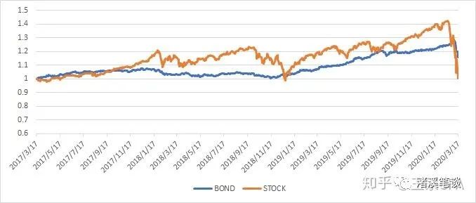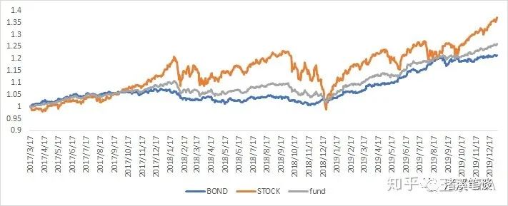 我们就按这种策略进行改进,展示下这种策略2017到2020的收益曲线(动态调整就不展示了),可以看到多配债券少配股票确实更平滑,途中灰色。(红色为股票,蓝色债券 )
