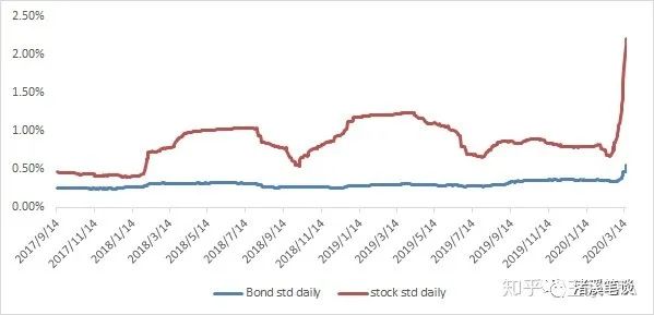 举个简单,但原理相似的例子。我们观察到长期的股票债券滚动波动率如下图。