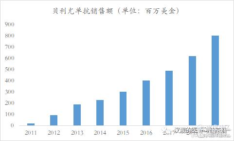 作为唯一一款FDA批准、治疗SLE的生物制剂Benlysta(倍力腾;通用名:Belimumab),和我们上面提到的泰它西普靶向两个细胞因子不同,Benlysta仅靶向B淋巴细胞刺激因子BLyS,且是一款全人源单抗药物,用于治疗自身抗原呈阳性,且正在接受标准治疗方法五岁及以上的活性SLE患者,2011年贝利尤单抗的静脉剂在美国上市,2017年皮下注射剂获批。Benlysta销量如图5所示,2019年收入约为8亿美金,其中美国市场占比87%。