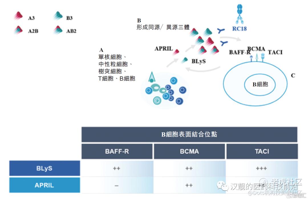 资料来源:泰它西普招股书;注:A3=APRIL同源三聚体;B3=BLyS同源三聚体;A2B=两种APRIL以及一种BLyS分子中的异源三聚体;AB2=一种APRIL以及两种BLyS分子的异源三聚体。