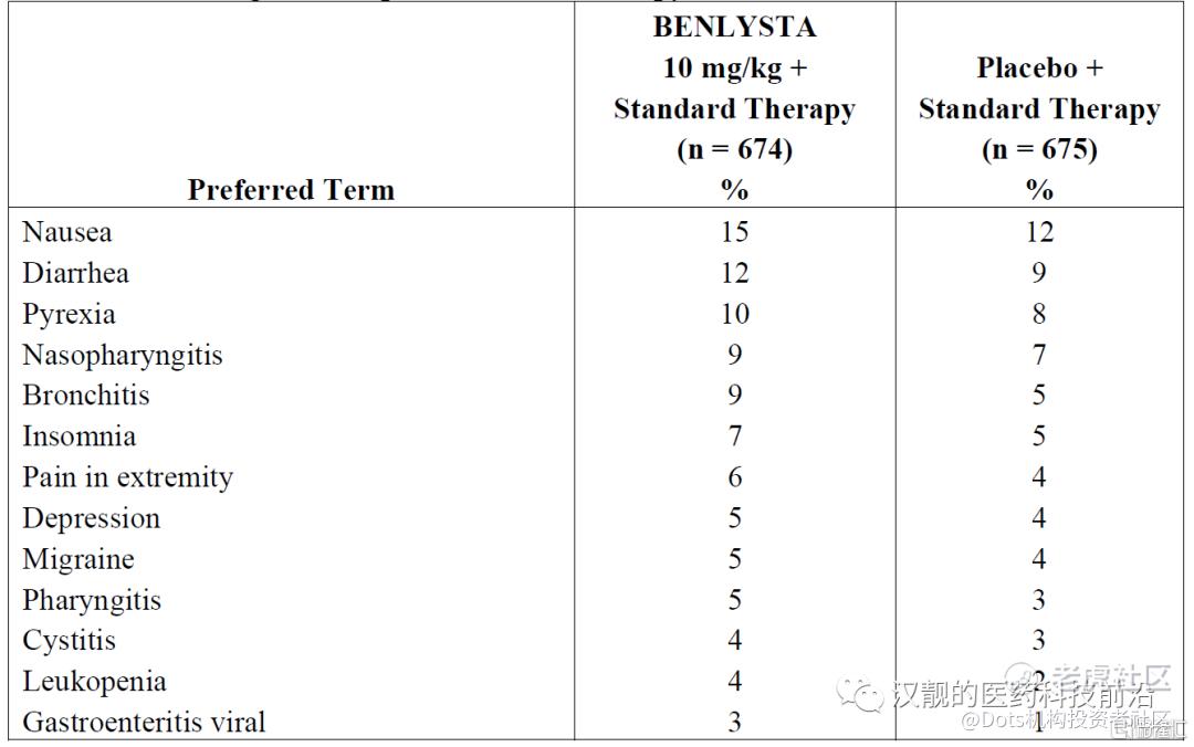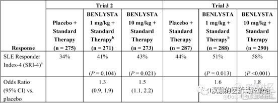 从图7可以总结出,在Trial 2和Trial 3中,Benlysta(10mg/kg)和标准疗法的联用相比于安慰剂+标准疗法联用,第52周的SRI-4响应率都有了显著提高。