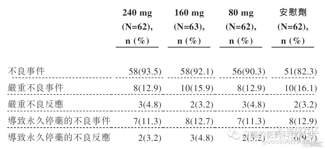 对249名患者进行的临床IIb研究的安全性结果如图3所示,可以总结出,三个剂量组的泰它西普的严重不良事件和反应的比例都和安慰剂差不多,展示了泰它西普良好的安全性和耐受性。