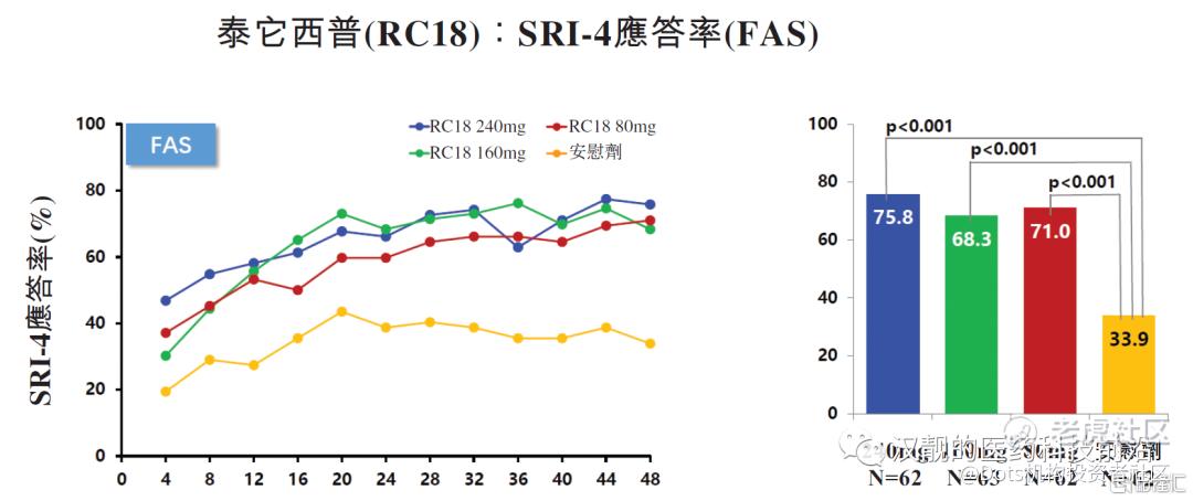 有效性结果表明(如图4):在FAS(全分析集:包括全部249名患者)和PPS(符合方案集:包括192名随机患者,患者已接受至少12剂泰它西普并完成SRI-4评估)分析中,接受泰它西普治疗的所有三个剂量组的患者,48周的SRI-4应答率都显著高于安慰组。其中,在FAS分析中,泰它西普240mg、160mg、80mg和安慰机组的48周SRI-4的响应率分别是75.8%、68.3%、71.0%和33.9%。