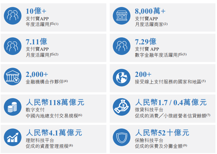 公司的数字支付服务支持国内商家与消费者在各类线上和线下支付场景下,以便捷安全的方式进行交易。与此同时,公司是阿里巴巴集团旗下淘宝、天猫和 1688.com 等平台上的主要支付服务提供商。
