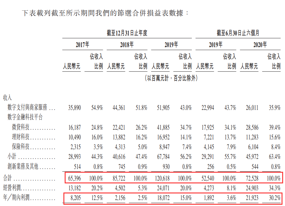 主要包括区块链和数据库服务。公司的蚂蚁链 BaaS(Blockchain as a Service)开放平台支持区块链上的各类应用以及增值服务。截至 2020 年 6 月 30 日止 12 个月期间,蚂蚁链平台产生了超过 1 亿个日度活跃上链数据,包括专利、凭证和仓单等。