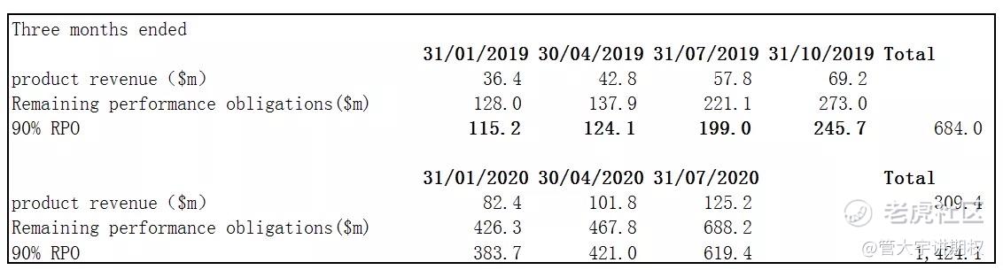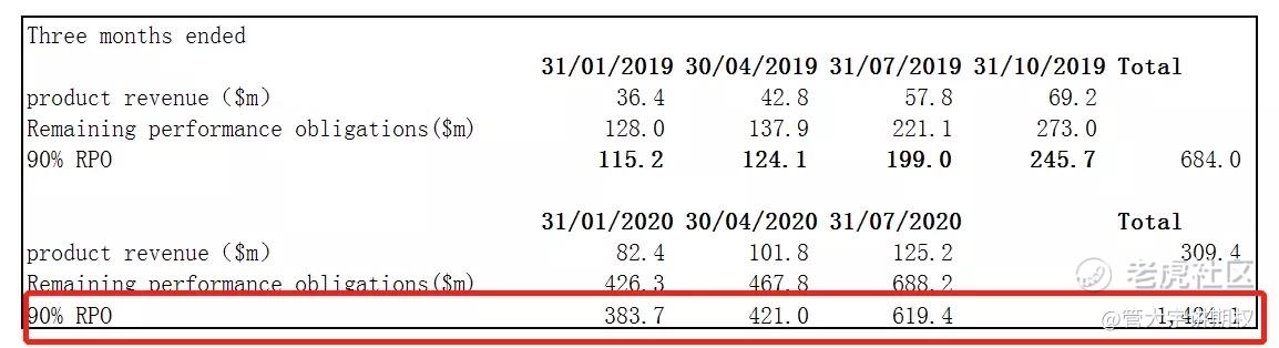 2020年7月31日之前,基本就14亿美金的储备。如果把2020年1、2月的RPO减去,那2020年1月的RPO大概是128亿。2020年前3个季度也有11亿美金的RPO储备收入。只是说2020年2季度有不少RPO可能是2、3年或者多年的合同。那么我们再打个折扣,前3个季度的RPO打7折,也有7亿美金。这里还没算2020年下半年的收入,四季度有旺季效应。假设下半年和上半年增速一样,也有7亿美金的收入,那全年可能就有14亿美金的收入确认。相比2020年的5亿美金,可能就接近2倍的增长。