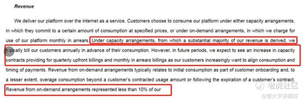 上面这段话,on demand revenue,临时的收入(不是合约收入)占比不到10%,暗示RPO的收入就有90%。而且公司大部分的收入都是提前一年支付的。所以假设这90%的RPO收入是在下一年确认的,是符合之前的情理的。但是公司也说了2020年2季度,有些公司是签了多年的合同,multiple year contracts, 所以保守起见,2020年的RPO可能会在2021年或者之后确认,而不是都在2021年确认。