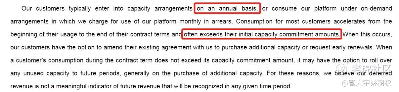 划重点,客户虽然一般按年提前付费,但流量基本都是不够用的,后续还会和雪花购买。这里就是亮点,也证明了雪花的产品力很强。也就是说,雪花给出的RPO是客户的最低消费,后续年份的收入确认会比现有的从RPO中可以确认的数字要高。
