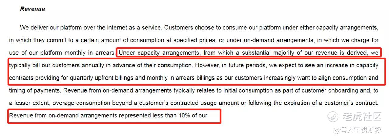虽然RPO的收入确认要发生在客户使用后,不确定具体的时间点。但如下图所说,雪花给客户的账单基本是按年付的,未来会有更多的季度提前预付的账单,也暗示了大部分RPO收入是可以按年来确认的。而且只有10%的收入是发生在临时的需求上,90%都是来自RPO。
