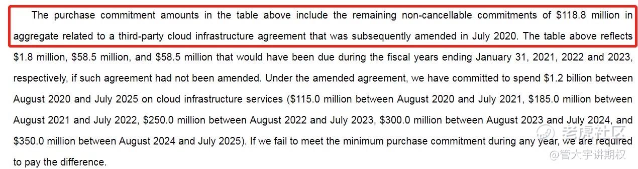 未来5年公司将要和第三方采购的云服务基础架构最低消费为2.4亿美金,增速接近20倍。这也暗示着公司的需求巨大,急需扩大平台设施。其中,1.18亿美金的采购额是2020年7月才修改的,也符合公司说的,满足不了目前市场的需求,同时也暗示公司从2020年7月之后是加速发展期。