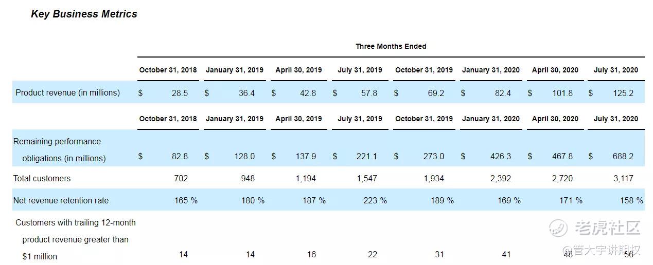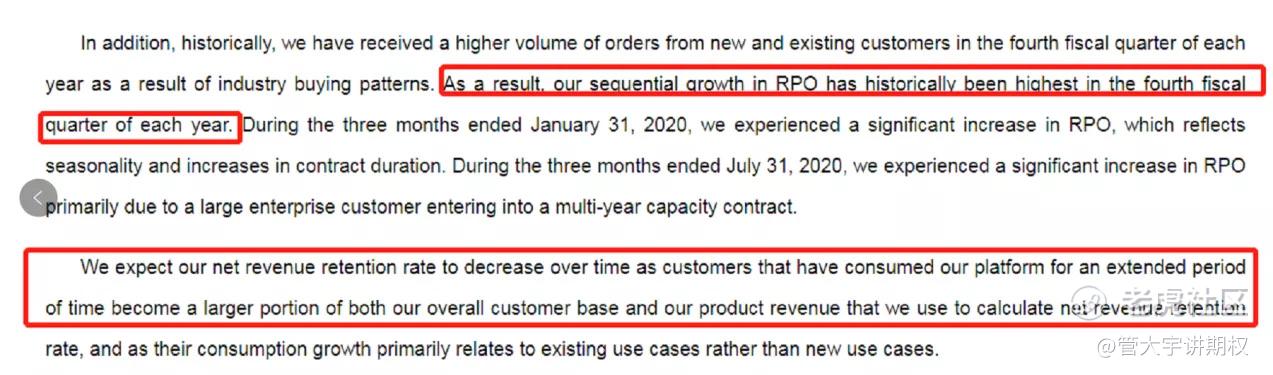 Remaining performance obligations是客户提前支付的,不可退还,但还没确认的收入,是未来收入的蓄水池。下面的截图可以看出,RPO在每年的四季度是旺季,从而推测2021年1月31日的报表RPO增速是此年度的高点,也就是说,在3季度上市给予的高估值,4季度出报表后有一定的安全垫将估值调整下来。