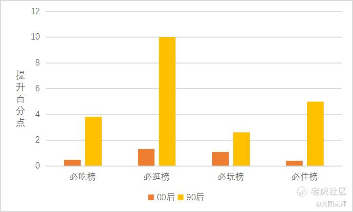 从用户年龄角度观察,使用必系列榜单的用户群体快速年轻化。相较去年同期,各个必系列榜单中“90后”、“00后”用户的占比均有较快提升,显现出年轻群体在品质住宿、娱乐购物、美食旅行多方面具有强大的消费潜力。