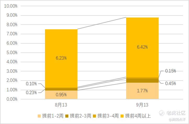 对具体的消费者预约行为分析可见,在提前一周以上预订的订单中,提前1-2周、提前2-3周、提前3-4周和提前4周以上的各类型订单均呈现环比增长趋势。其中,提前4周以上预订酒店的订单占比最高,一直维持在6%以上;提前2-3周预订的订单占比则增速最快,9月份的订单量占比相对8月上升了0.22个百分点。