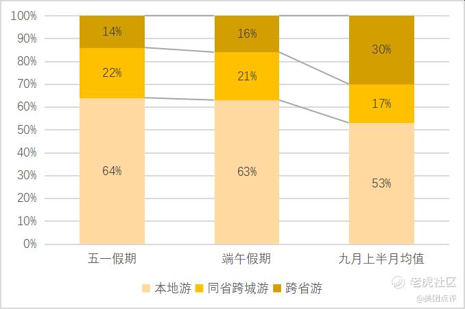 美团平台大数据显示,与今年“五一”假期和端午假期相比,9月上半月异地游的景区门票订单数量大幅上升,异地游订单占比达到47%,其中跨省游订单量占比更是升至30%,显示出游客长途出行的意愿更加强烈。预计国庆假期景区门票的异地订单总量将超过本地订单量,跨省游有望快速恢复。