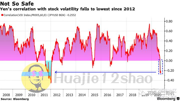 这世道,用日元$日元主连(JPYmain)$ 来避险也不太好使了,日元与股市波动性的相关性跌到2012年最低。。。