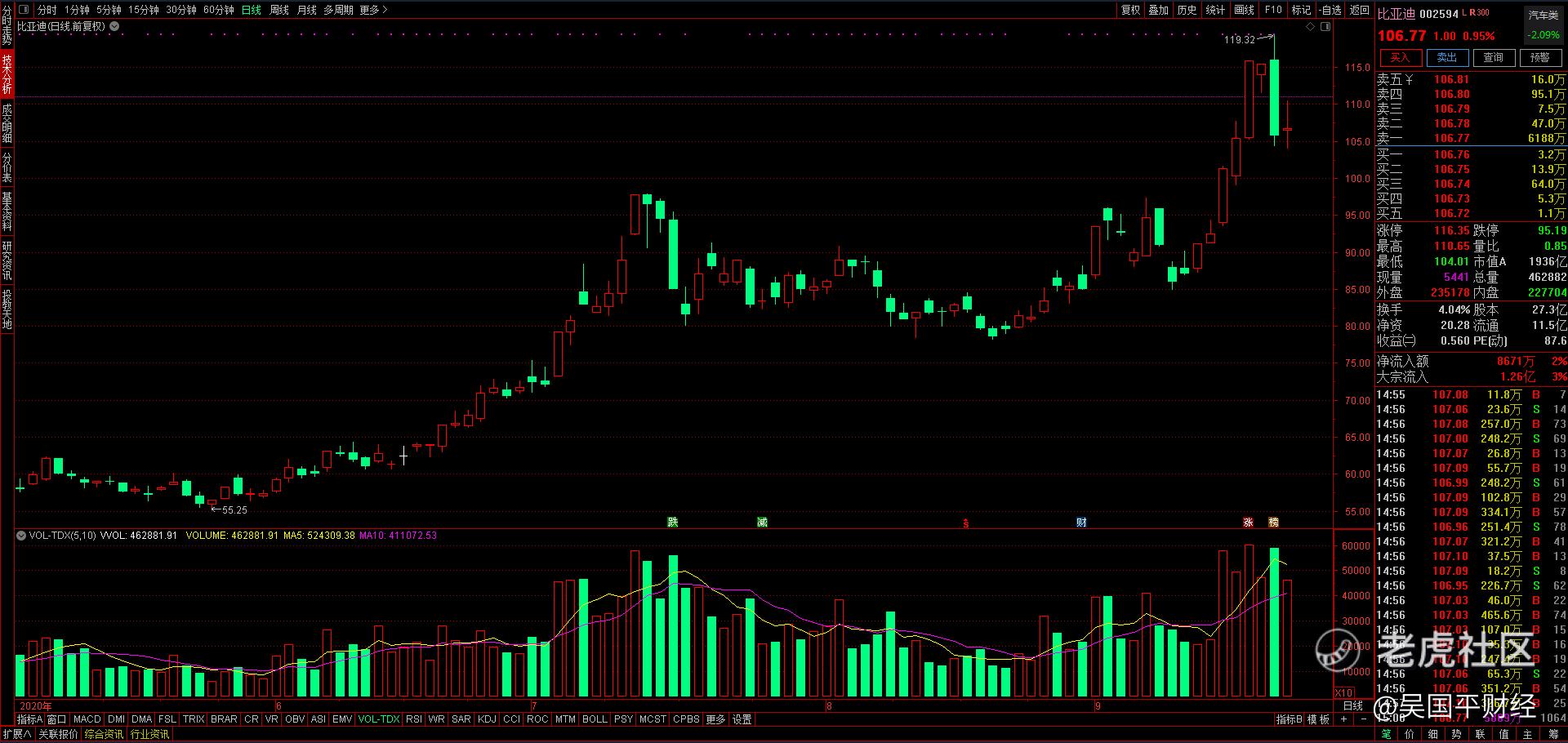 第二,我们观察一下两个很重要的板块,新能源跟科技板块。其中两个标志性的品种,一个是比亚迪,一个是中芯国际。比亚迪今天冲高回落动荡,最终出现一个近似于十字星的阳十字星走势。中芯国际今天其实也是冲高回落动荡,最终收出一个阴字阴线的走势,但总的来说这两个个股盘中都积极冲高,整体来说,今天没有持续性的往下杀跌,本身已经说明在这个位置已经受到了一些资金的支撑。在今天的市场背景下,它们呈现这样的状态,是不是预示着接下来这个领域应该还有更多的精彩呈现出来,这点我们不妨继续拭目以待。一旦出现更多精彩,那么对市场未来行情的演绎一定会带来积极的意义。