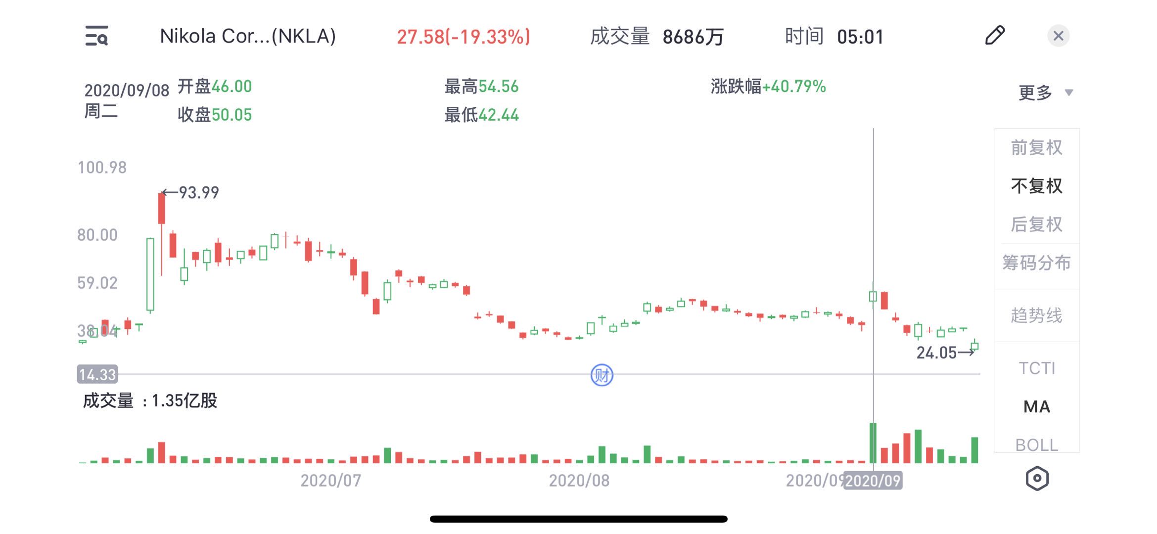 虽然这只股票在美国因为蹭着特斯拉的热度圈了一波粉,实际上在老虎关注的人并不多,而我之所以关注到这只股票,还是因为9月11日通用汽车宣布将以20亿美元购入氢燃料重型卡车制造商尼古拉(Nikola,NASDAQ:NKLA)11%的股份,可提名一位董事会成员,并将在2022年前生产其氢燃料电池电动皮卡Badger。消息一出后,尼古拉股价飙涨大约40%。我还想着这大腿挺粗的,准备抄个底,结果它就被做空了,做空机构Hindenburg Research在9月初发布研报,称Nikola是一个“错综复杂的骗局”,建立在Trevor Milton职业生涯中超过50个谎言之上。Nikola的对外宣传误导投资者,谎称供应商的电动汽车重要技术为自行研发的技术。做空机构香橼此后力挺Hindenburg,称Nikola完全欺诈,愿承担一半的法律诉讼开销。