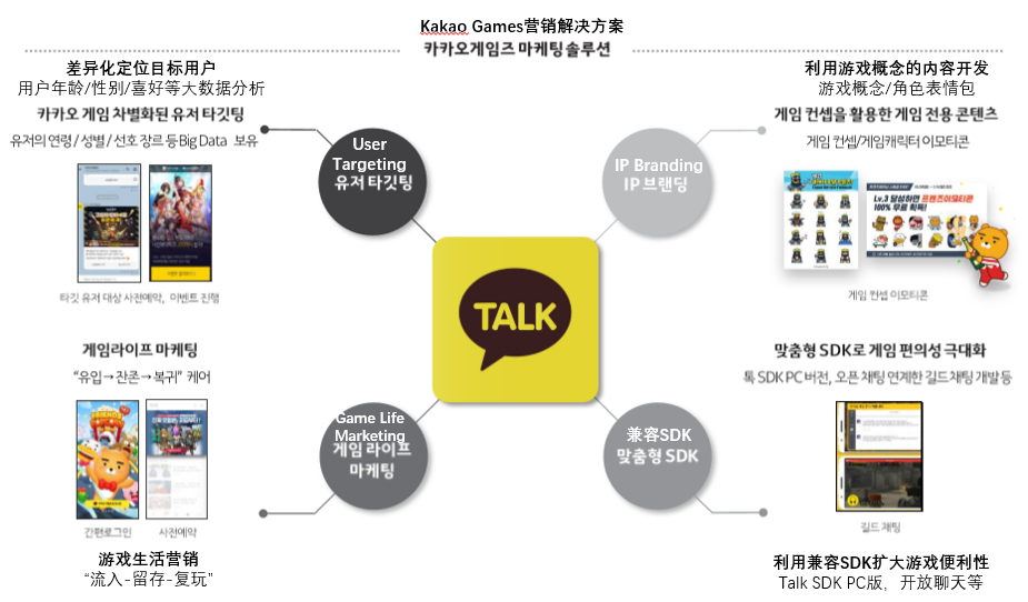 Kakao Talk平台对Kakao Games的作用主要有四方面:(如图Kakao Games营销解决方案)