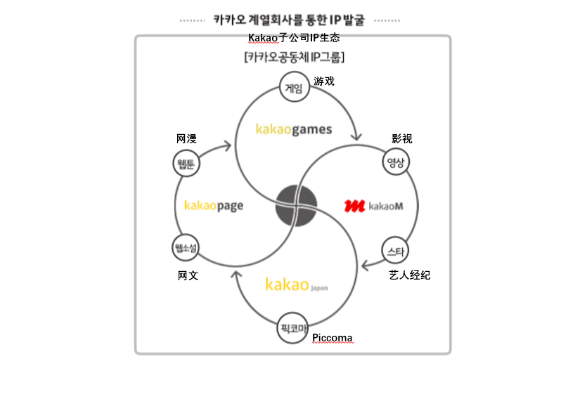 从Kakao Games所呈现出的商业模式来看,无疑就像是腾讯游戏的韩国版再现。Kakao以韩国国民级社交软件Kakao Talk作为其支柱,不断扩展其业务外延。近年来,Kakao在内容领域的布局较为突出,通过Kakao Games、Kakao Page、Kakao M以及Kakao Japan,Kakao打造出自身的IP内容开发闭环,可以对IP进行游戏、网文、网漫、影视等全产业链形式的开发。