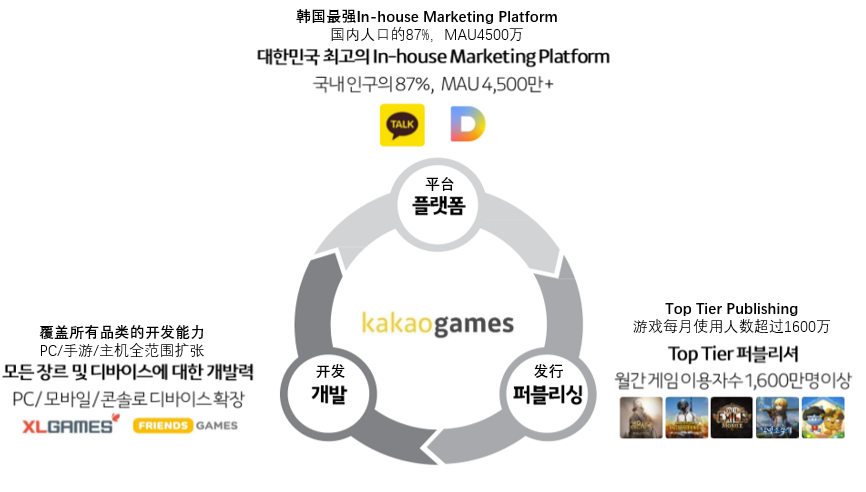 Kakao Games将自己定义为综合游戏企业,而公司的业务围绕平台、发行与开发进行,三大业务各自独立但又有所联动,形成Kakao Games内部的业务闭环。