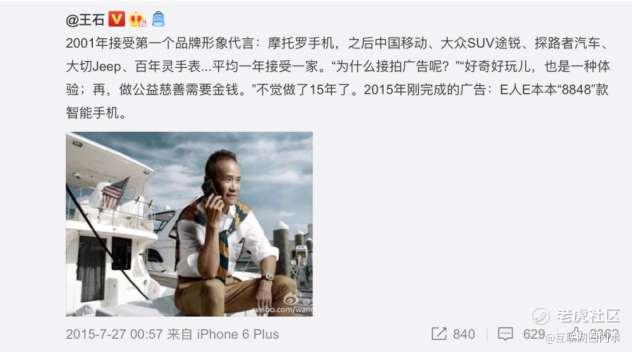 用王石自己的话说:2001年接受第一个品牌形象代言:摩托罗手机,之后中国移动、大众SUV途锐、探路者汽车、大切Jeep、百年灵手表...平均一年接受一家。“为什么接拍广告呢?”“好奇好玩儿,也是一种体验;再者,做公益慈善需要金钱。” 不觉做了15年了。2015年刚完成的广告:E人E本,“8848”款智能手机。