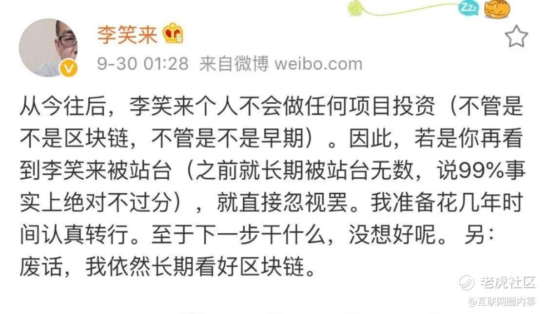 在2018年9月30日的凌晨1点半,李笑来发了这样一条微博:从今往后,李笑来个人不会做任何项目投资(不管是不是区块链,不管是不是早期)。因此,若是你再看到李笑来被站台(之前就长期被站台无数,说99%事实上绝对不过分),就直接忽视罢。我准备花几年时间认真转行。至于下一步干什么,没想好呢。