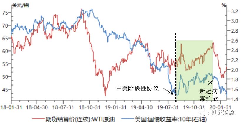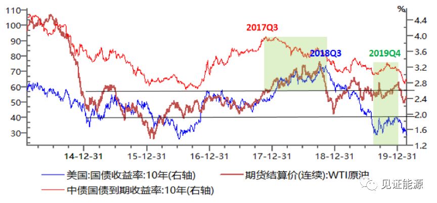 首先我先简单的回顾一下需求供应平衡能源价格的这五六年的历史,其中我采用中美债券收益率这个数据,用它来简化的评估全球总需求变动的趋势;