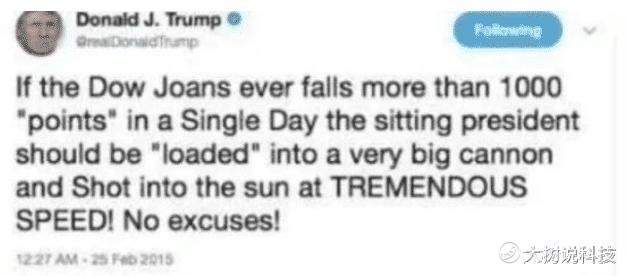 “如果道琼斯指数未来有一天单天跌幅超过1000点,那么那时候的美国总统应该被放在大炮里面以光速发射去太阳 ,没有借口!